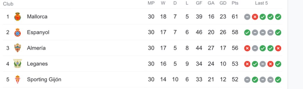Real Mallorca are struggling. Yes I know they are top of the league but if we’re honest since they beat their promotion rivals Almeria four games ago they’ve stuttered. They’ve won two, drawn one and lost one but the wins were a struggle and so was the draw on Saturday night. The defeat worryingly, was in no doubt against possible automatic promotion outsiders Sporting Gijón. The only thing keeping them at the top is the inconsistency from all the other teams around them. In fact when you look at the last five games amongst the top five, Mallorca are the most consistent!