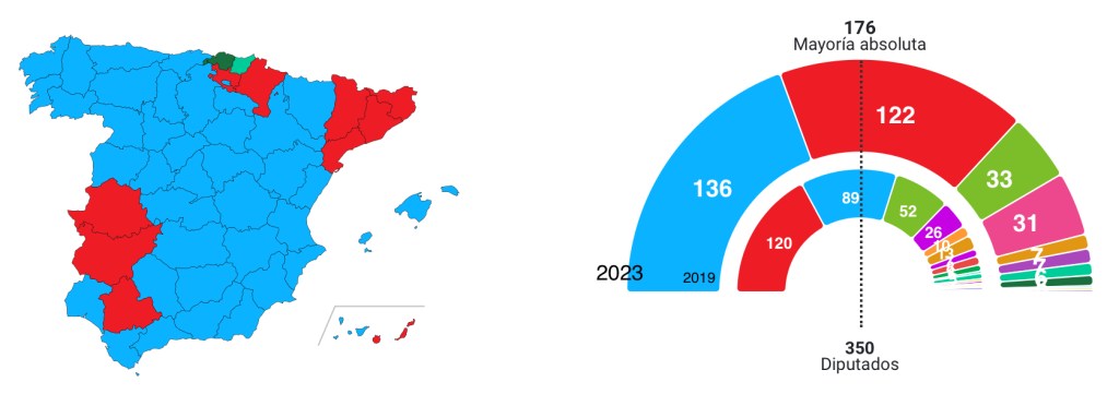 With voting finishing in Spain last Sunday, neither of the main parties got enough votes to govern. Meaning they would need to go into a coalition with other parties but that may prove very difficult as neither party it seems will get enough to pass the threshold of 176 seats. I would imagine another election maybe called in December like in 2019 when the same thing happened. In the meantime the country will limp along with the current coalition regime not able to do too much. When you look at the political map of Spain and the islands you have to seriously doubt how the Socialists can claim a victory.