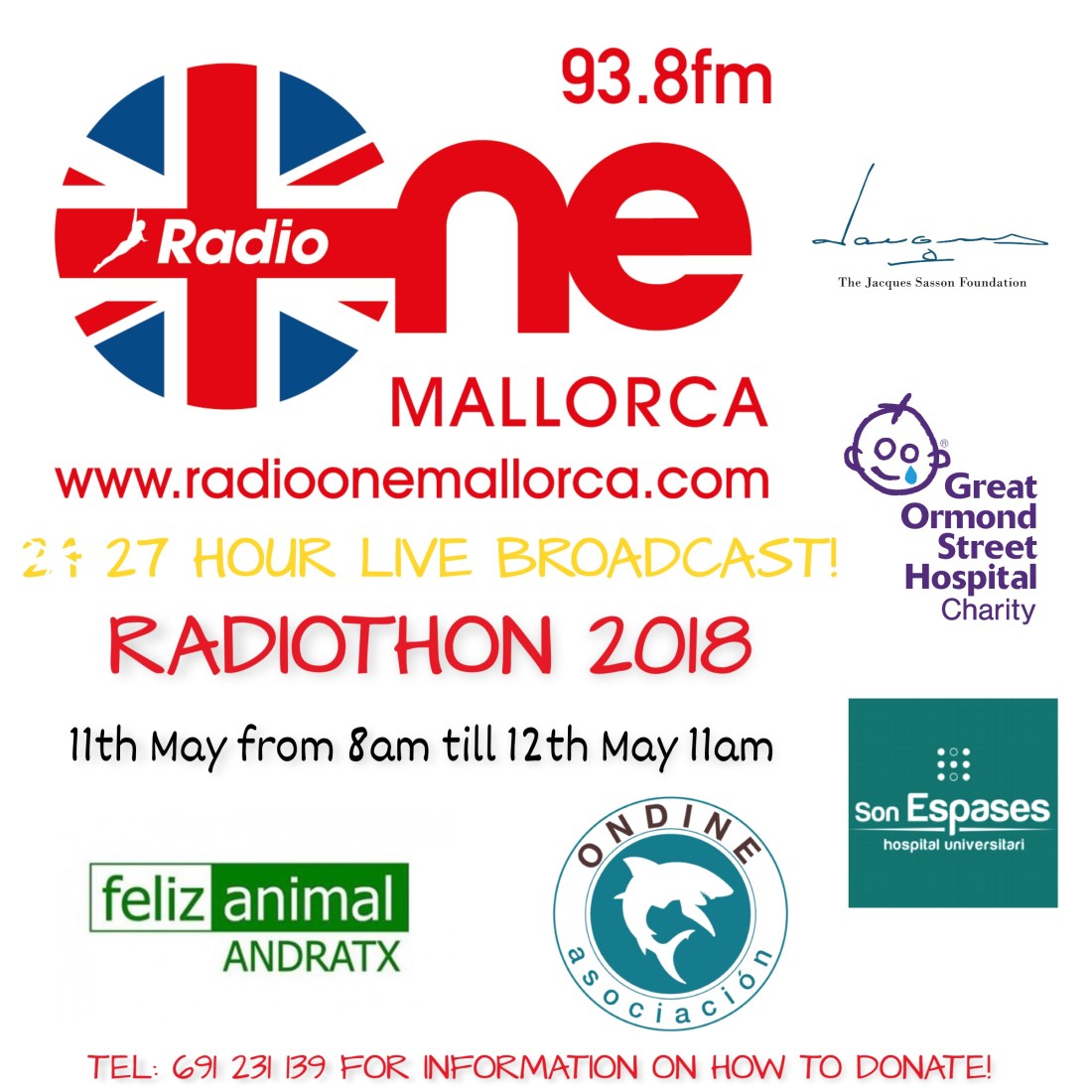 I am very happy to announce that we raised €14,855.00 from our Radiothon. Meaning that we will be able to donate €3,719.62 to each of our four charities. Great Ormond Street Children’s Hospital, Asociación Ondine, Son Espases Intensive Care unit for Children and Feliz Animal Andratx. Massive thanks to everybody who contributed and helped us reach our total. Thank You!